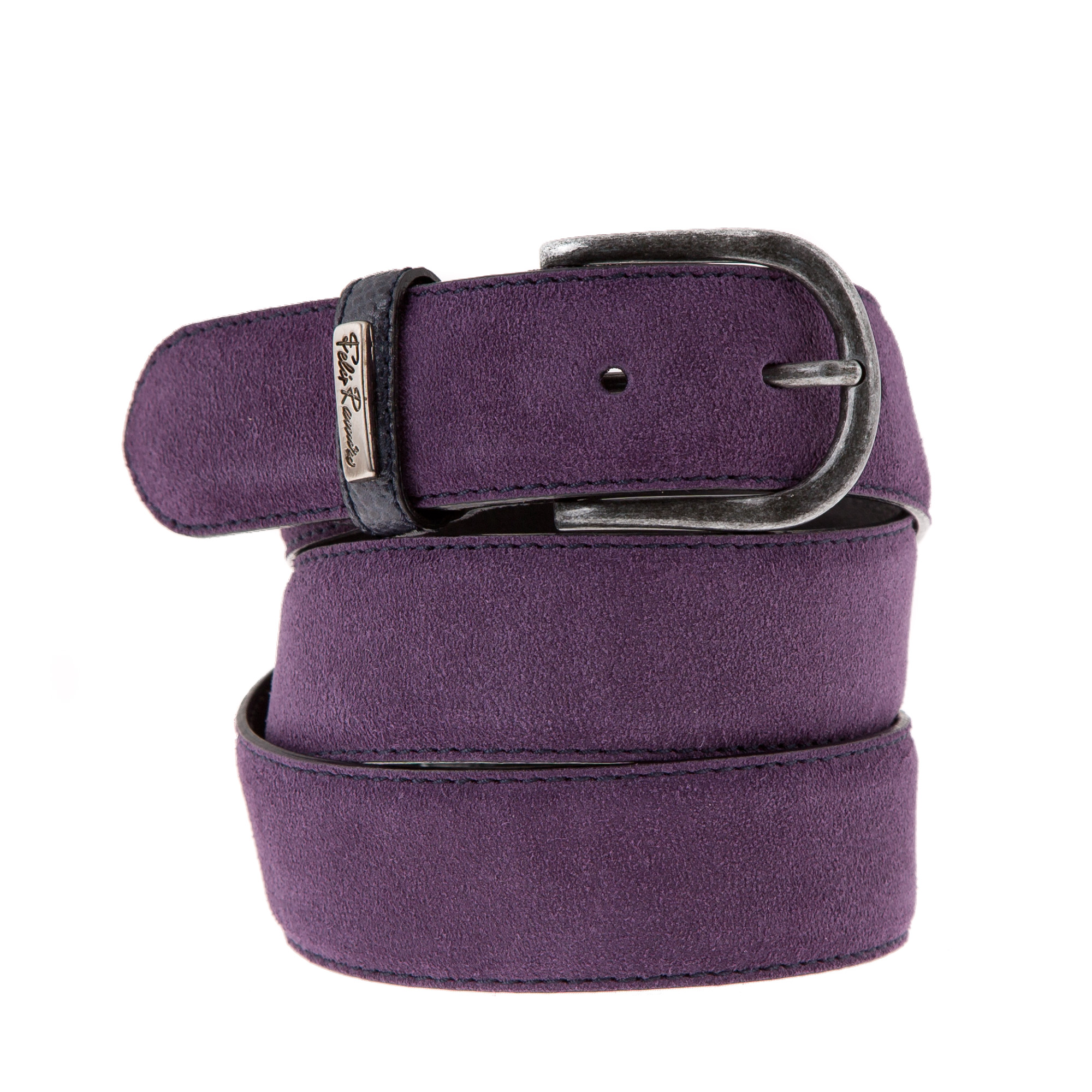 Curea Piele Violet Detalii Bleumarin, de culoare violet, cu detalii bleumarin și cataramă metalică.