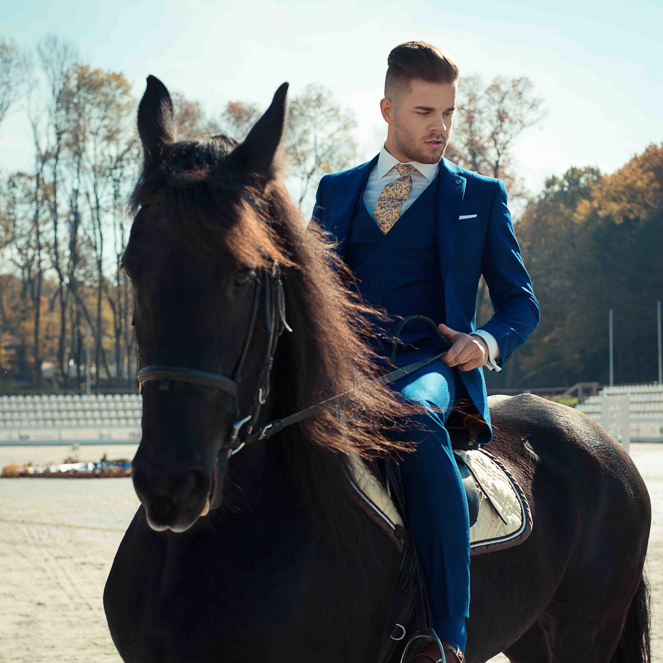 • Cravată în nuanțe de albastru, cu model interesant